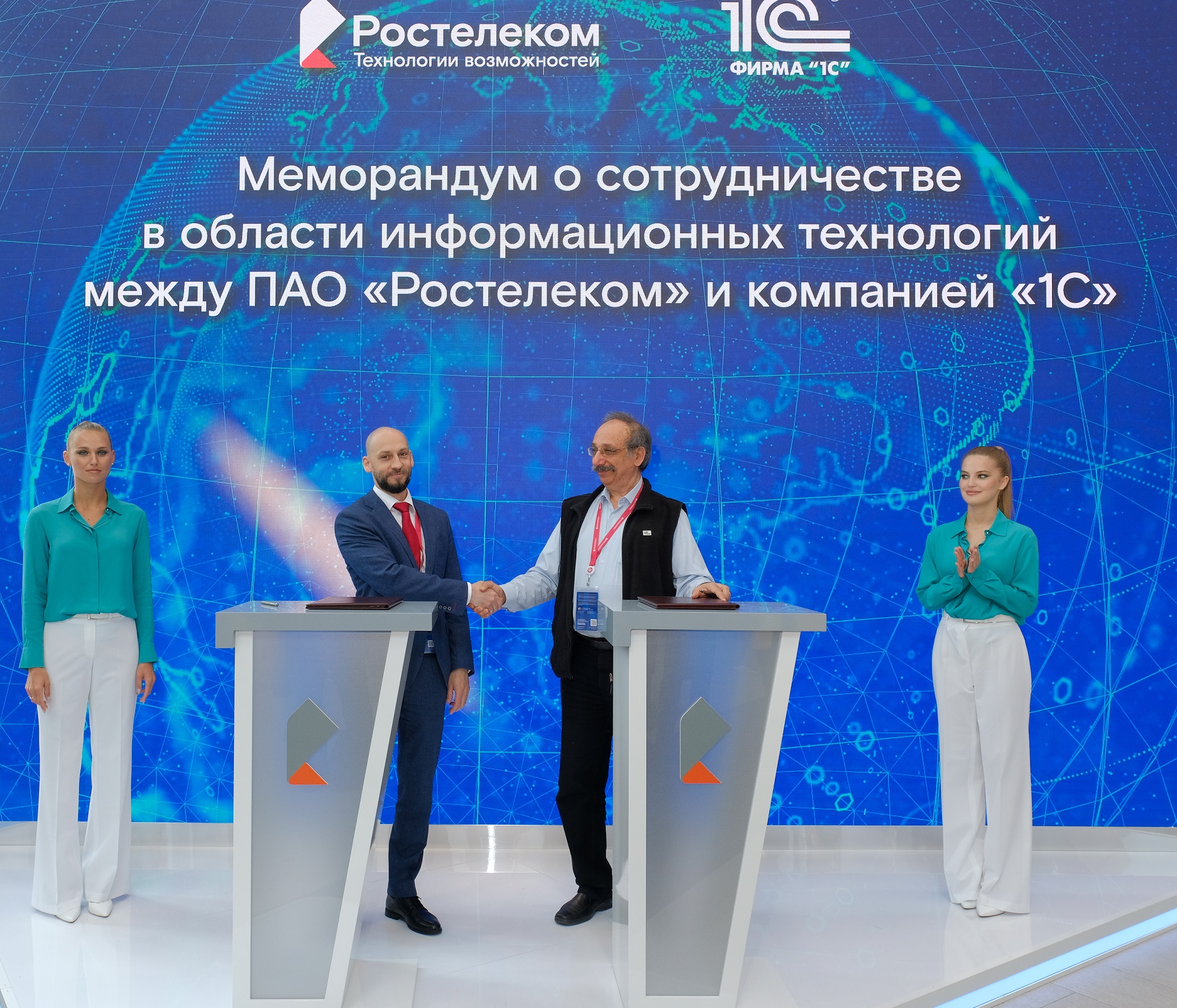 Первый вице-президент компании «Ростелеком» Сергей Анохин и директор фирмы «1С» Борис Нуралиев подписали на Петербургском международном экономическом форуме меморандум,