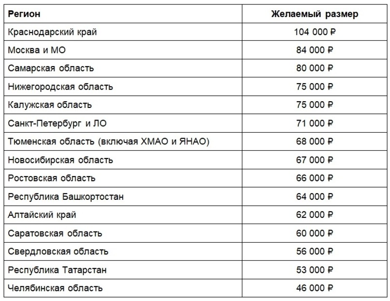 Респонденты из Нижегородской и Калужской областей рассчитывают после завершения карьеры получать по 75 тыс. рублей в месяц, жители Санкт-Петербурга и Ленинградской области — 71 тыс., Тюменской области — 68 тыс., Новосибирской области — 67 тыс.