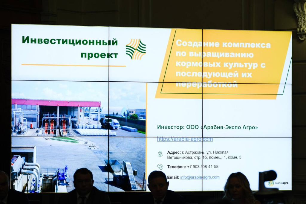 В режиме видеоконференцсвязи проект представил генеральный директор "Арабия-Экспо Агро" Дмитрий Макаров. Общий объём инвестиций составляет более 2 миллиардов рублей. Цель проекта − создание агрокомплекса замкнутого цикла по выращиванию кормовых и зерновых культур с последующей промышленной переработкой и производству высококачественных кормов для сельскохозяйственных животных.