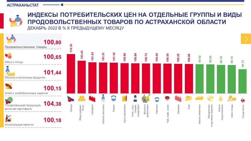 Стоимость минимального набора продуктов питания по Астраханской области в среднем на конец декабря 2022 года составила 5203,76 рубля в расчете на одного человека и за месяц повысилась на 0,73 %. Больше всего изменение стоимости затронуло фрукты и овощи. Сезон закончился, и цены поползли вверх. В среднем рост составил 10,3 %. Больше всего подорожали свежие огурцы (на 39,84 %) и свежие помидоры (на 29,65 %). Цены на картофель выросли на 7,63 %, свёклу — на 7,19 %, капусту — на 3,48 %. Из фруктов сильнее всего подорожали бананы — на 7,78 %, виноград — на 2,31 %, апельсины — на 2,18 %. При этом снизились цены на лимоны (на 4,97 %) и яблоки (на 2,50 %).