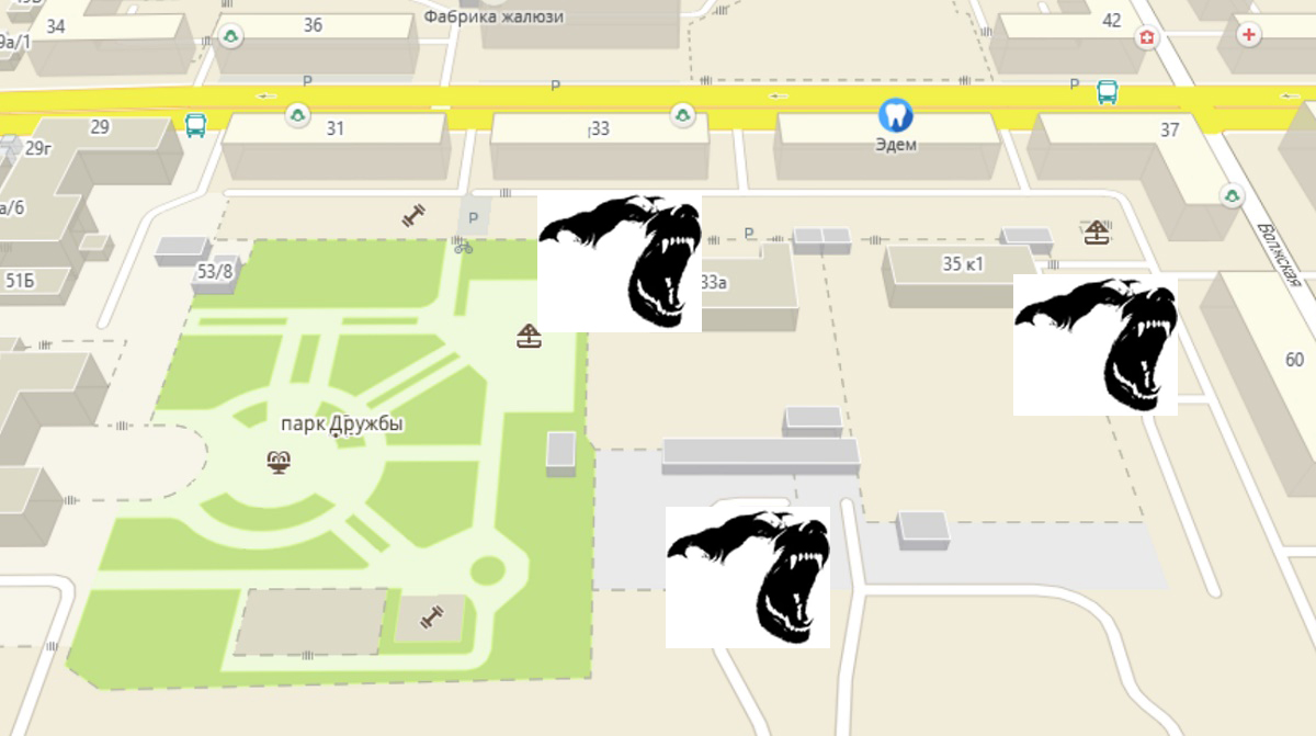 На главном фото указаны места обитания агрессивных собачьих стай у парка «Дружбы».