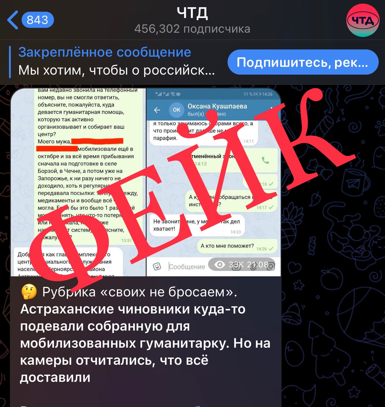 Суть материала в канале сводится к тому, что собираемая астраханцами гуманитарная помощь для военнослужащих в зоне СВО не доходит до адресатов. Никаких подтверждений, кроме скриншота переписки жительницы Черного Яра и сотрудницы якобы Центра соцподдержки к материалу не прикреплено.