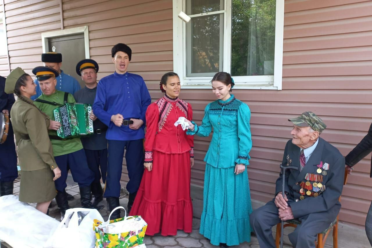 В преддверии Дня Победы в рамках всероссийских акций «Фронтовые бригады» и «Гости к ветерану» артисты ансамбля традиционной песни астраханских казаков Областного научно-методического центра народной культуры поздравили в