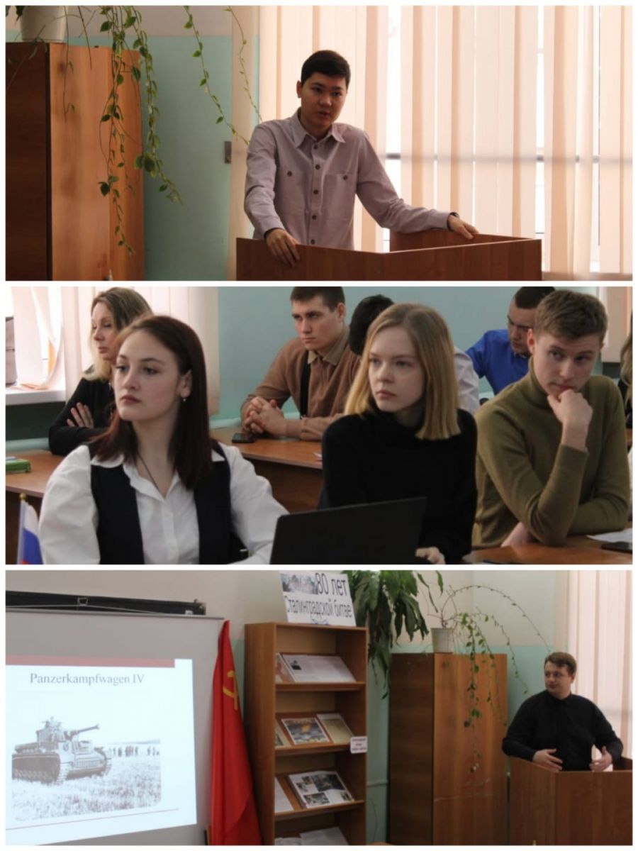 Был просмотрен видео-ролик о Сталинградской битве. Студенты подготовили выступления, начиная с ожесточенных боев на подступах к Сталинграду и до полного освобождения Сталинграда от фашистских захватчиков. Все выступления можно сгруппировать по темам: Общая стратегия и сражения; герои-полководцы; герои-защитники Сталинграда; вклад Астраханцев в победу; участие Астраханцев в работе поисковых отрядов по увековечиванию памяти героев.