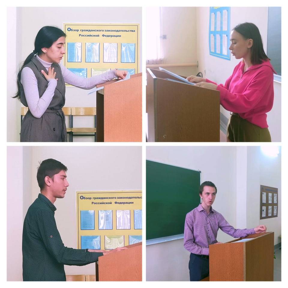 14 апреля среди обучающихся 3 курса по специальности 40.05.04 "Судебная и прокурорская деятельность" был проведен круглый стол "Судебное искусство красноречия". Выступали с докладами Шаипова Шовда, Мартынов Иван, Васильев Дмитрий, Моллаев Денилбек, Николаев Андрей и другие. Доклады были посвящены истории риторики. Отдельно стоит отметить доклад Мартынова Ивана (рассказ о Ф.Н. Плевако) и Шаиповой Шовды (мастер судебной речи А.Ф.Кони).