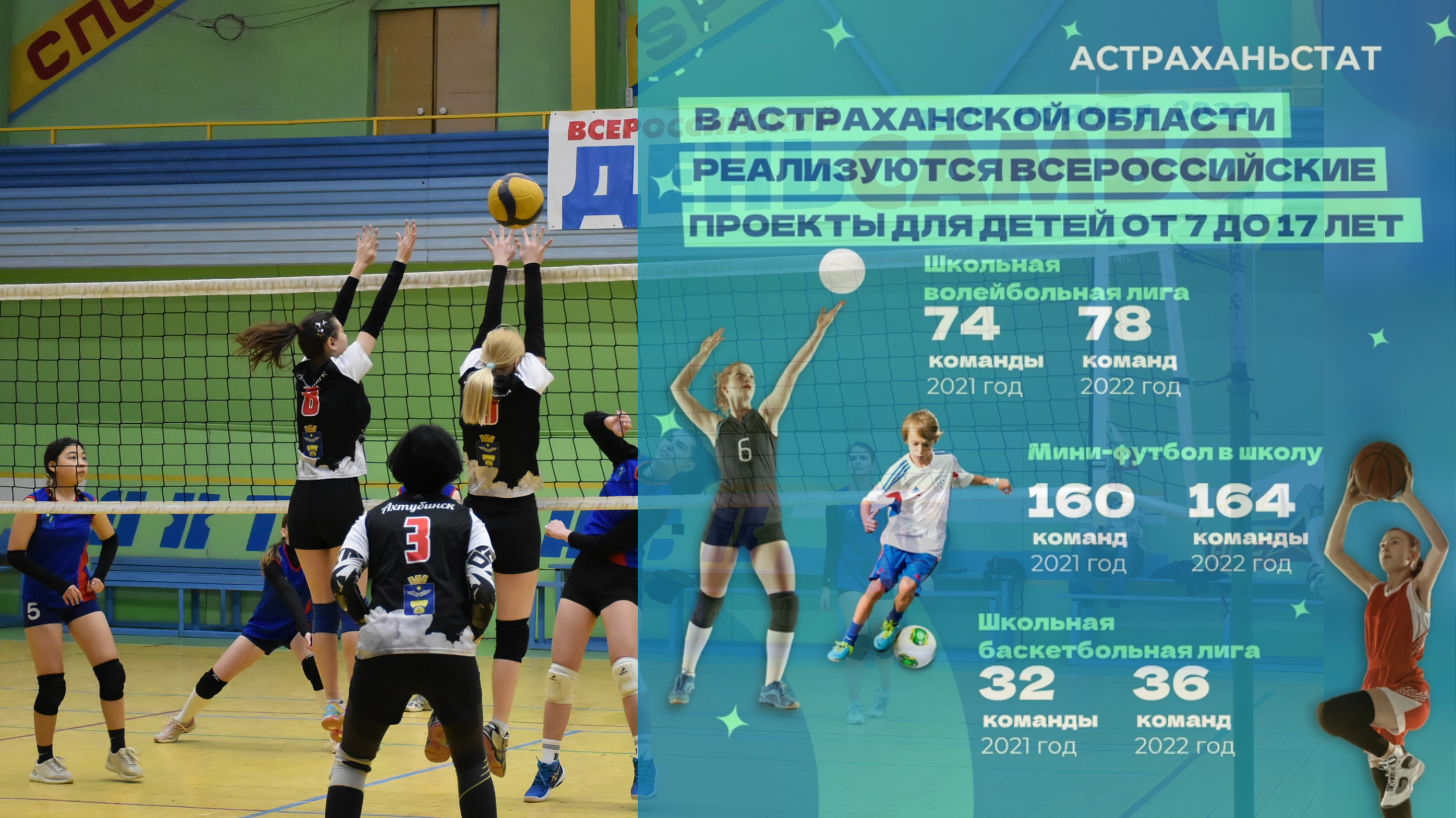 Астраханьстат утверждает, что в школах региона заметен рост числа спортсекций. Там стало больше занимающихся мини-футболом, волейболом, баскетболом и самбо.