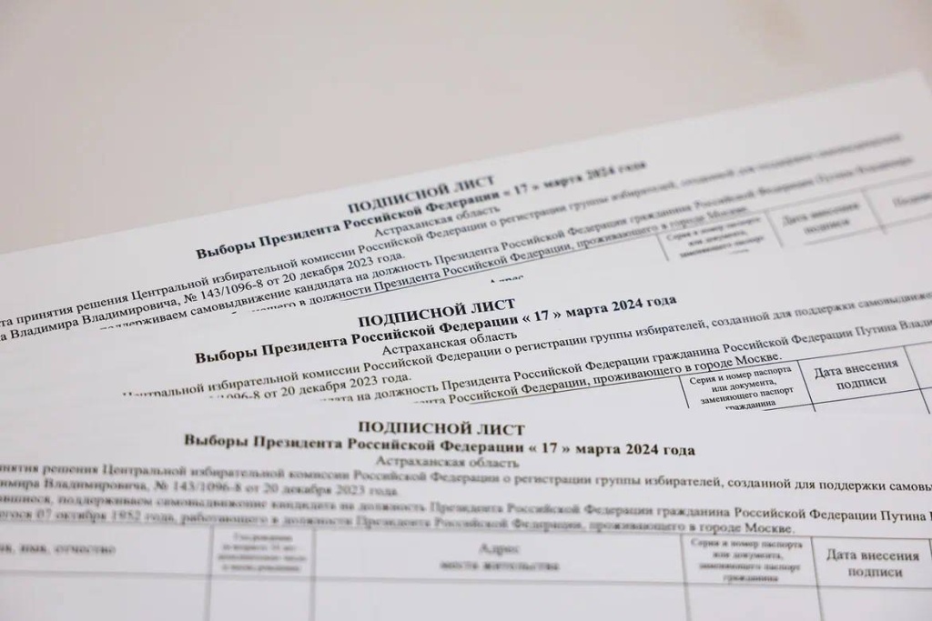 С 23 декабря 2023 года в Астрахани открылись волонтёрские пункты сбора подписей в поддержку выдвижения кандидата Владимира Путина на пост президента России. Проголосовать могут лишь совершеннолетние.