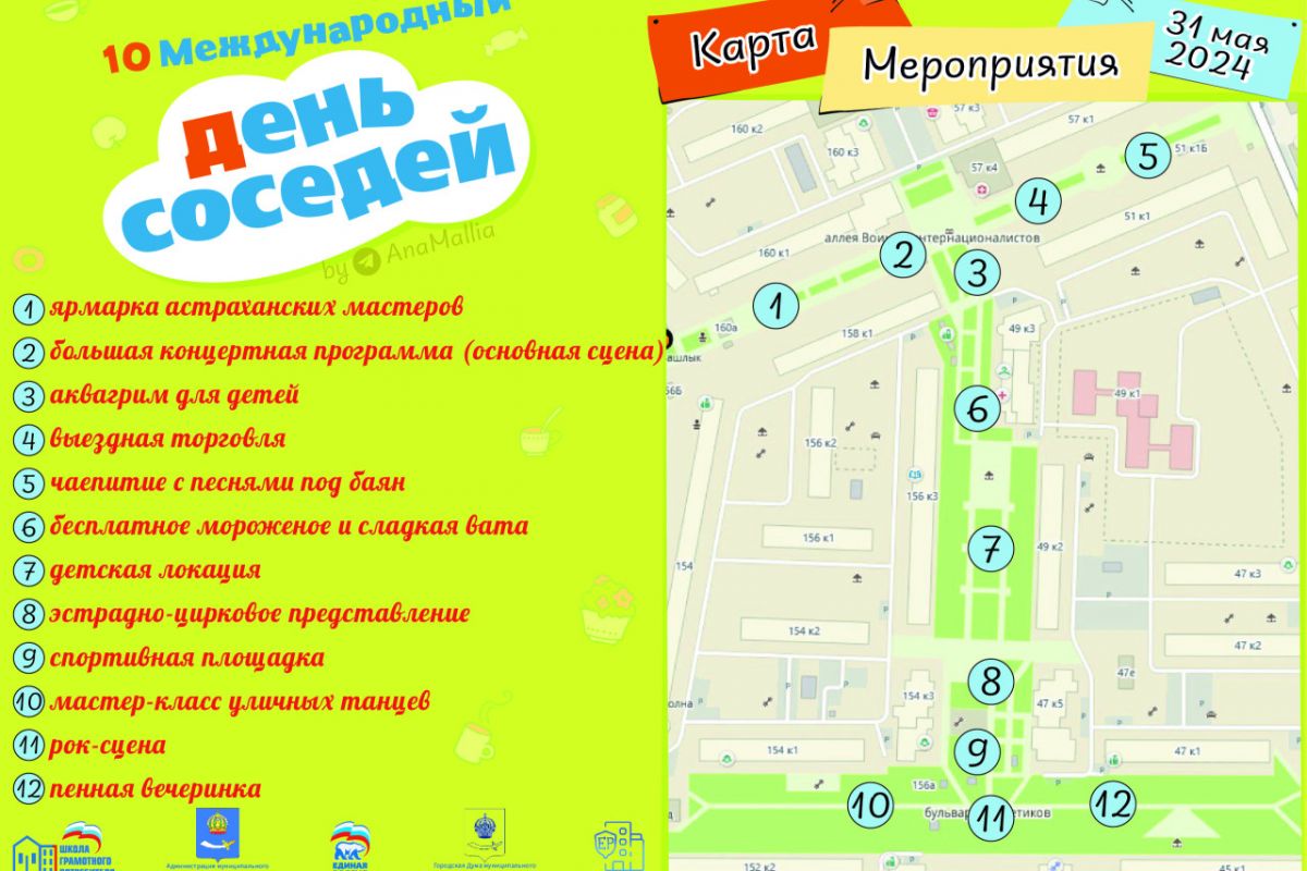 Собравшихся ждет насыщенная программа. Любители активного образа жизни попробуют свои силы на спортивной площадке и в мастер-классе уличных танцев. Для маленьких посетителей будет работать детская площадка с аквагримом и аниматорами. Яркие эмоции и позитив подарит пенная вечеринка. Участники угостятся мороженым, сладкой ватой и оценят ярмарку астраханских мастеров, смогут спеть под баян и присоединиться к чаепитию «по-соседски», с самоваром и баранками.