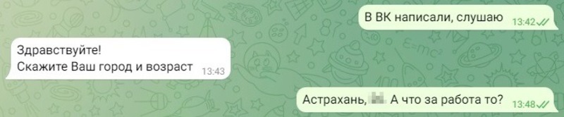 «Интернет-магазины размещают объявления о работе на платформе популярного мессенджера либо путём размещения объявлений на фасадах зданий. На первоначальном этапе объявления о наборе „сотрудников“ носят скрытый характер, а при отклике обговариваются более подробные условия „работы“. В этом случае потенциальный „работник“ сам выбирает — соглашаться или нет», — пояснили в УМВД России по Астраханской области.Но что будет, если всё-таки перейти по ссылке и написать им? Ради эксперимента мы рискнули. И вот что у нас получилось.