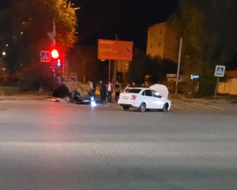 Выполнив поворот, водитель черной машины не уступил дорогу летящей на желтый «Гранте». Произошло столкновение. «Лада» снесла черный автомобиль так, что тот перевернулся на крышу.