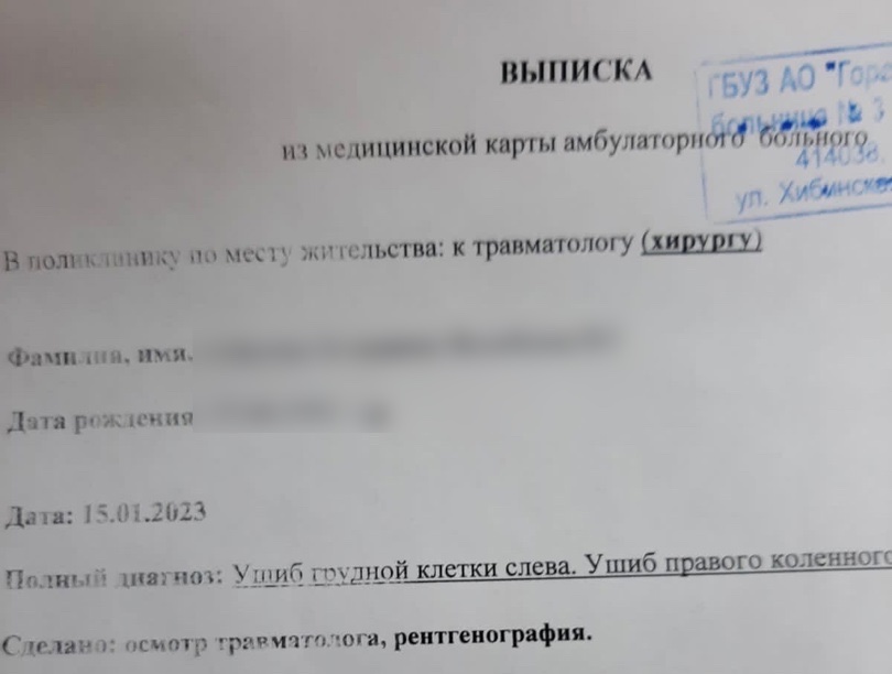 К своему посту общественница приложила протокол устного заявления из полиции и выписку из больницы, из которой следует, что перелома у волонтера все-таки нет, но зато есть ушиб грудной клетки и правого коленного сустава.