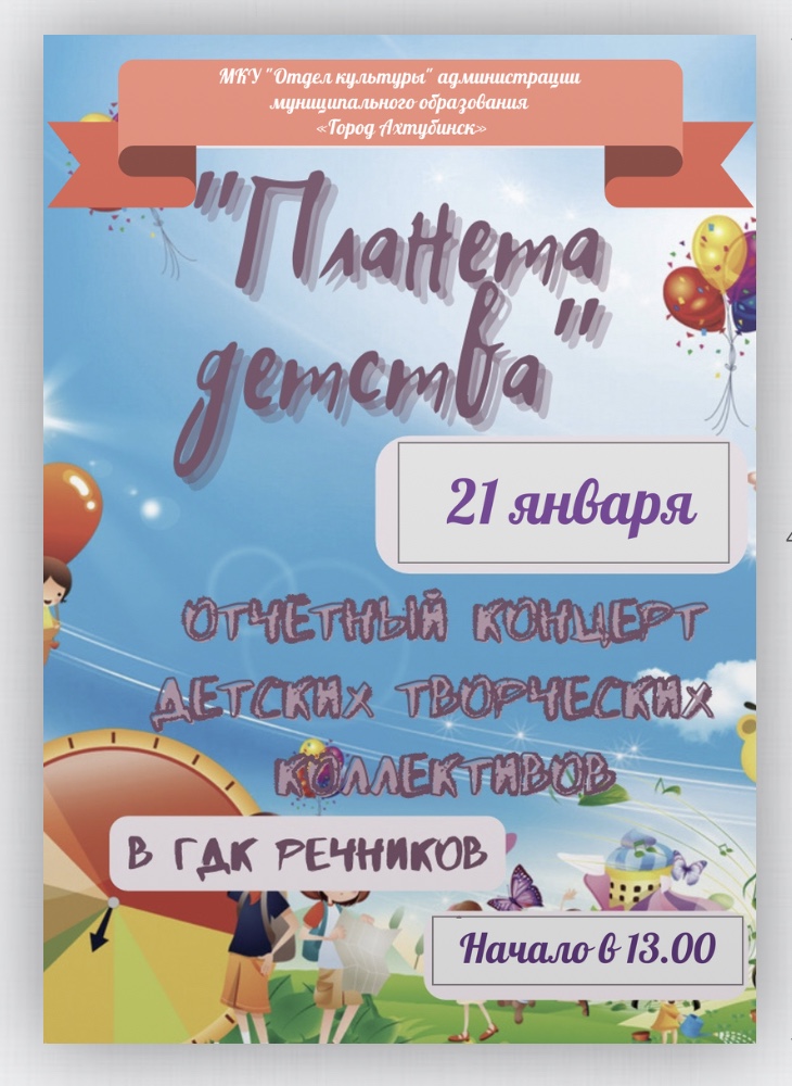 21 января в 13:00 МКУ «Отдел культуры» муниципального образования «Город Ахтубинск» приглашает всех в Городской Дом Культуры речников где состоится ежегодный детский отчетный концерт «Планета детства».