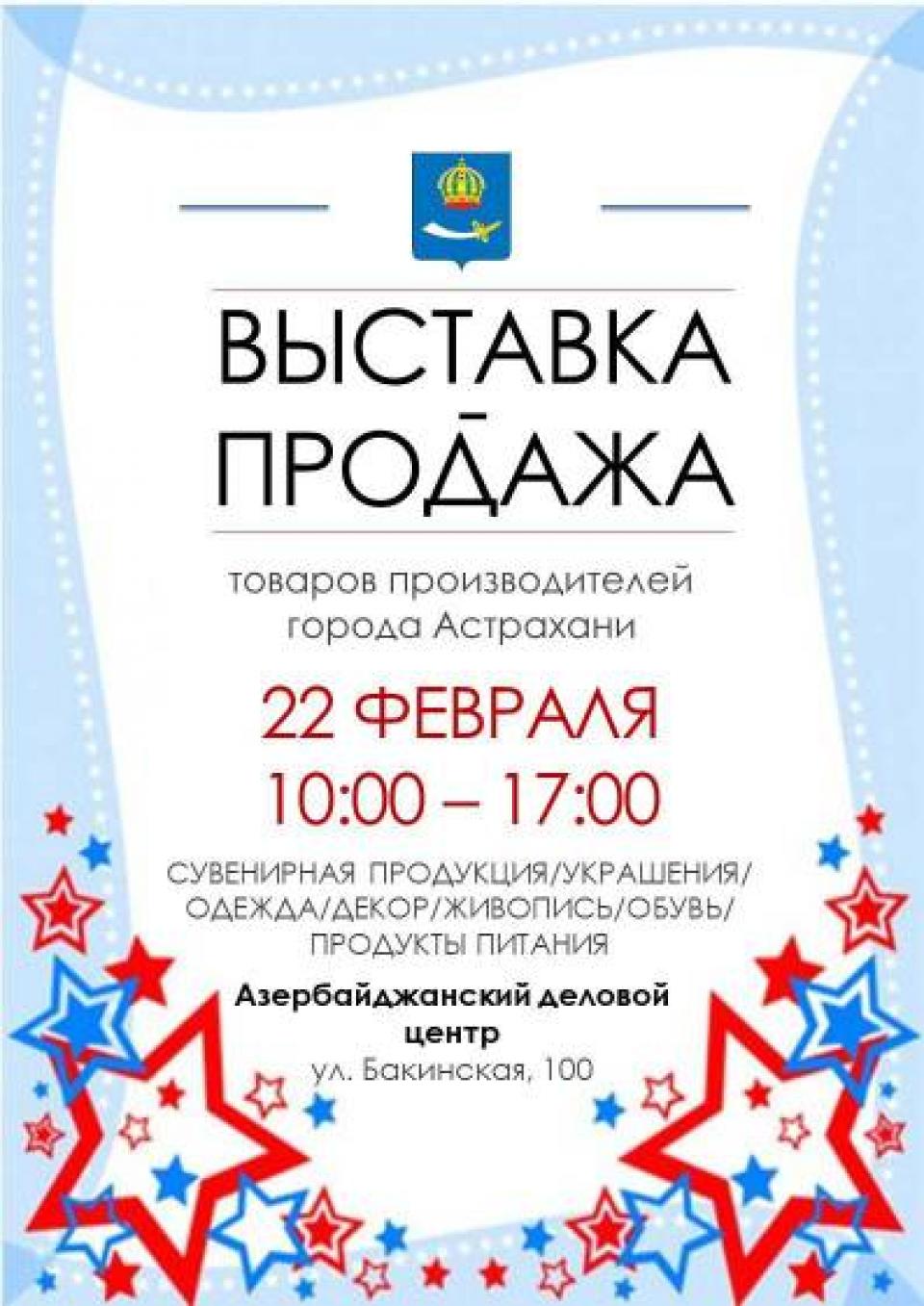 22 февраля с 10:00 до 17:00 в торгово-выставочном зале Азербайджанского делового центра (ул. Бакинская, 100) состоится выставка-продажа товаров производителей Астрахани.