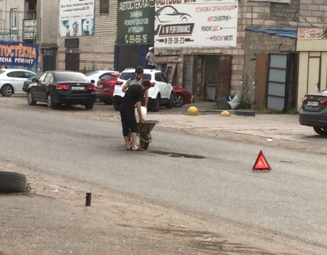 Не дождавшись, когда по улице проедет асфальтоукладчик, двое местных жителей сами принялись за дело и заделали огромную яму прямо посередине дороги. Об этом сообщили в группе «Астрахань online» . Судя по комментариям к посту, именно этот дорожный кратер успел навредить водителям.