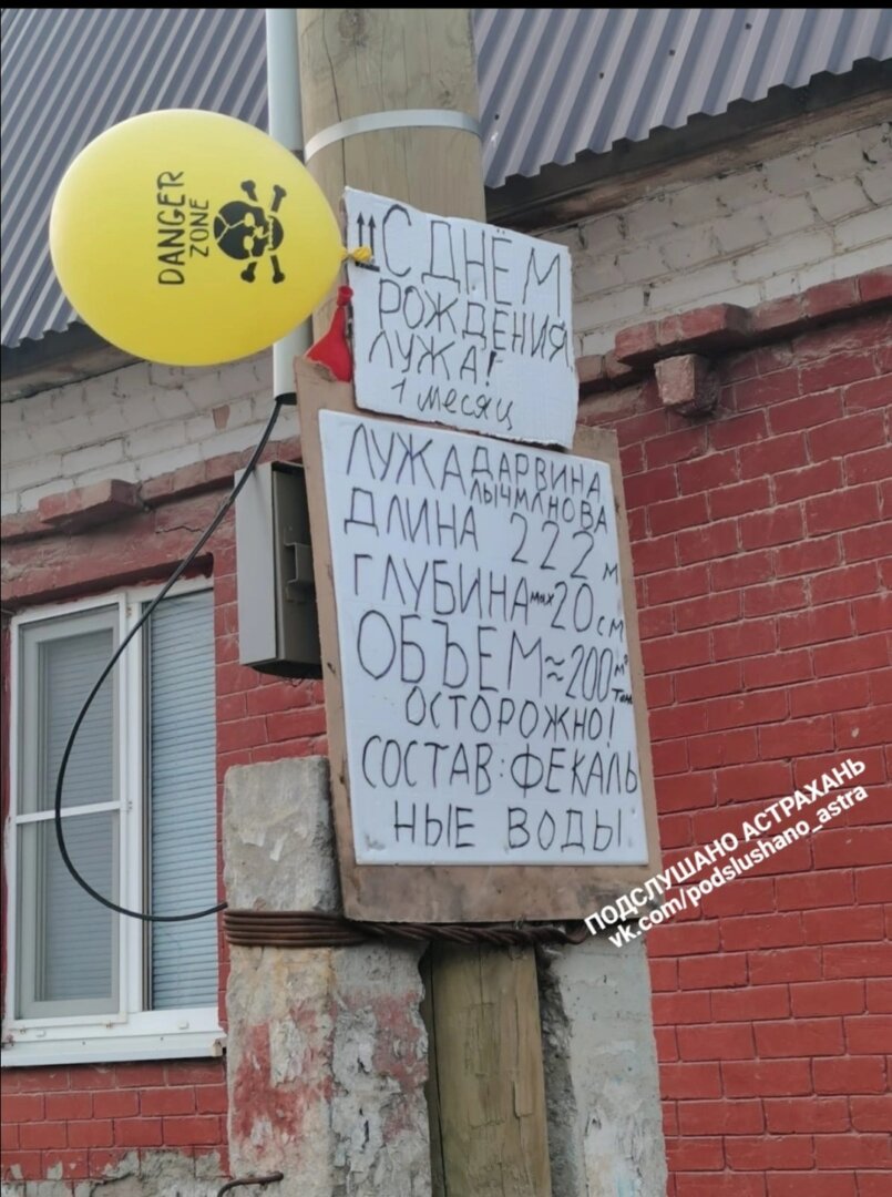 С первым (и хочется верить последним) маленьким юбилеем поздравили астраханцы лужу на улицах Дарвина и Лычманова. Ей исполнился месяц.