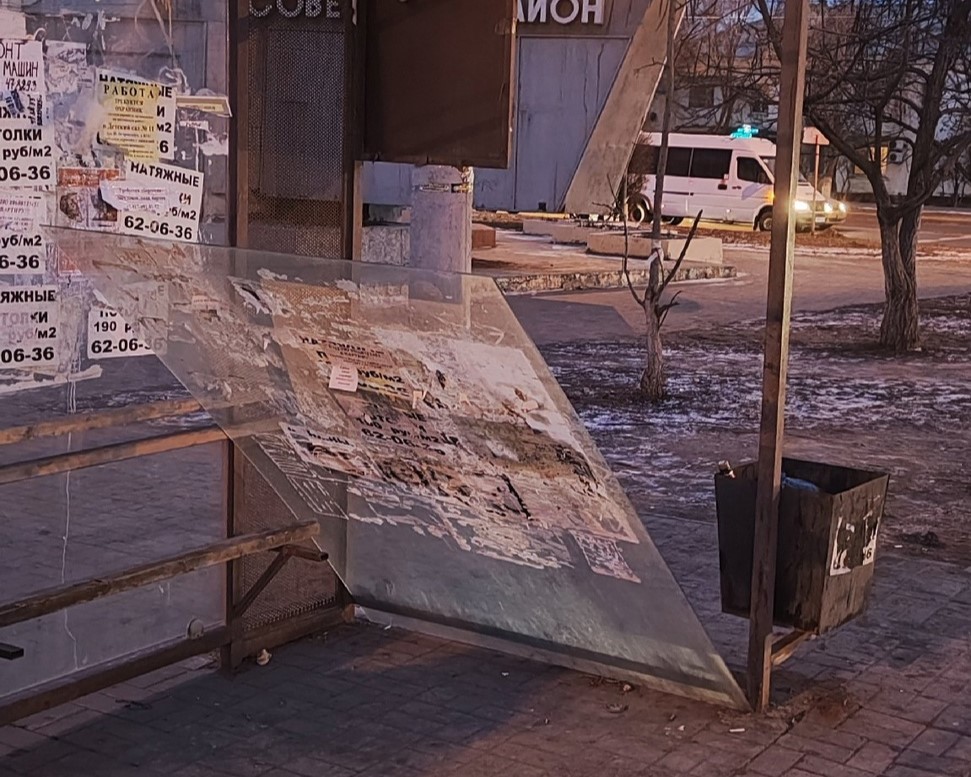 На перекрестке улиц Боевой и Николая Островского возле стелы Советского района была обнаружена опасная остановка. Все дело в ее боковой стеклянной панели, которая должна защищать от ветра. Неизвестно почему, но она оказалась вне своего рабочего места и теперь находится на земле, облокотившись на последнюю деревянную доску бывшей скамейки. Астраханцы переживают за свою безопасность, ведь панель в любой момент может разбиться.