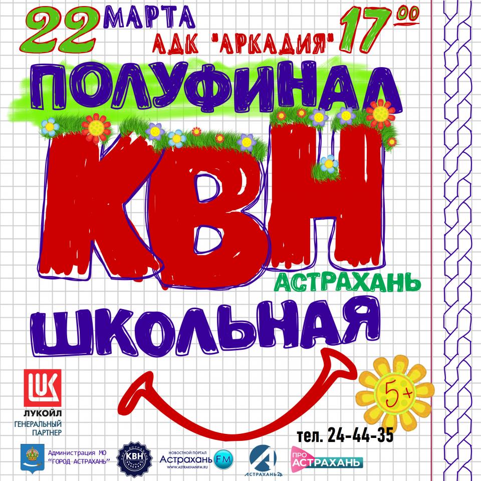 22 марта 2023 года в 17.00 в концертном зале Астраханского Дворца культуры «Аркадия» состоится полуфинал Лиги КВН «Астрахань. Школьная», с участием команд средних общеобразовательных учреждений города, области и других регионов.