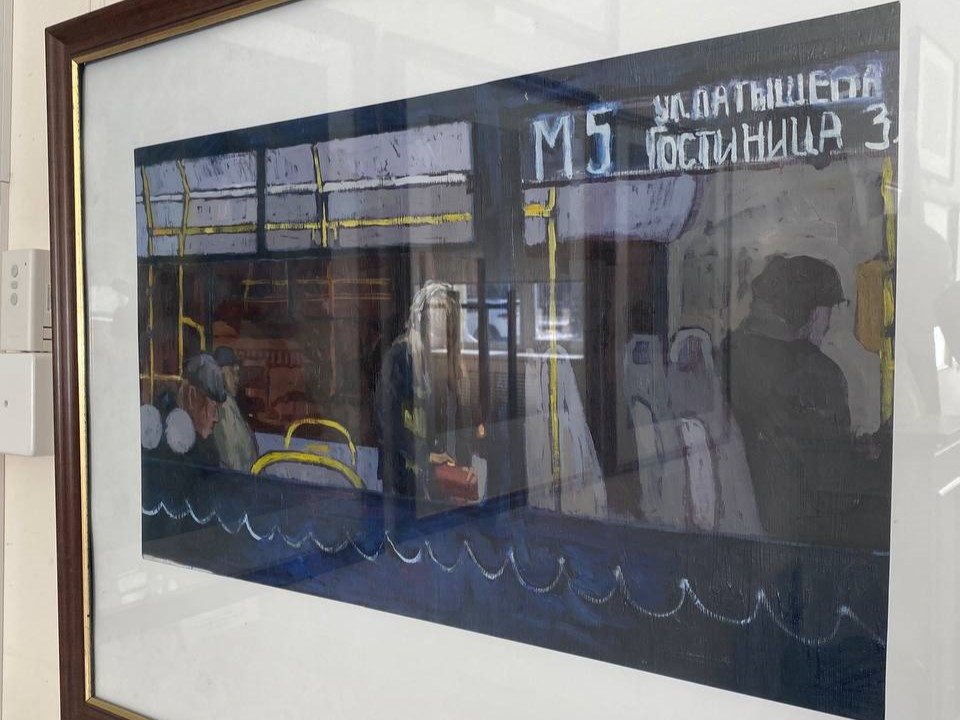 Там несколько дней назад прошла отчетная выставка студентов всех курсов. На ней представили около 70 работ, на одной из которых и изобразили уже почти не нового синего обитателя городских джунглей. Студентка 4 курса Анна Белова нарисовала салон автобуса M5. Внутри все оказалось так знакомо: несколько пассажиров, кресла, валидатор и электронное табло с конечными пунктами.