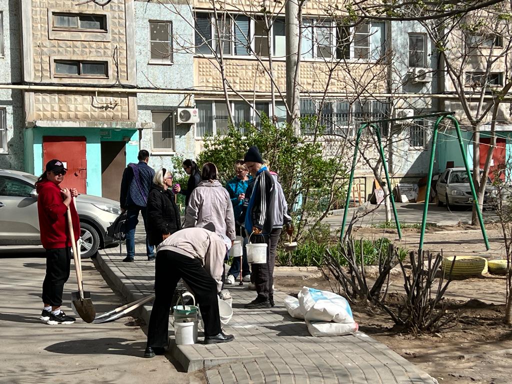 Здесь с самого утра кипела работа: кто-то собирал мусор, кто-то выкапывал лунки, кто-то готовил саженцы к высадке. Местные жители вышли на уборку двора целыми семьями. Собирали опавшую листву и сухостой, окапывали и белили деревья, приводили в порядок малые архитектурные формы.