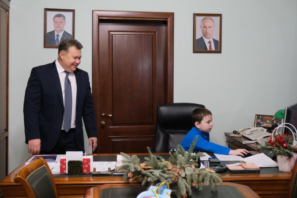 Несколько дней назад глава Астрахани Игорь Редькин снял с ёлки шарик с заветным желанием шестилетнего Абдуллы Магомедова. Мальчик загадал на Новый год подарок-сюрприз. Сегодня из рук градоначальника он получил конструкторы. Абдулла также познакомился с рабочим кабинетом главы Астрахани и даже посидел в его кресле и за компьютером.