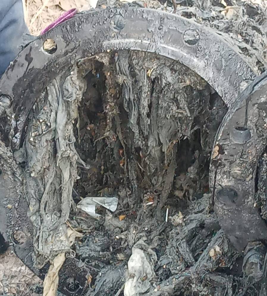 Как оказалось, в этом районе сейчас проводится реконструкция аварийного участка глубинной канализации. Соответственно, сточные воды сейчас перекачивает насос. И он засорился многочисленными тряпками, предметами личной гигиены и прочими отходами, которые должны оказываться в мусорке, но почему-то оказываются в канализационных трубах. Вот как это все выглядело: