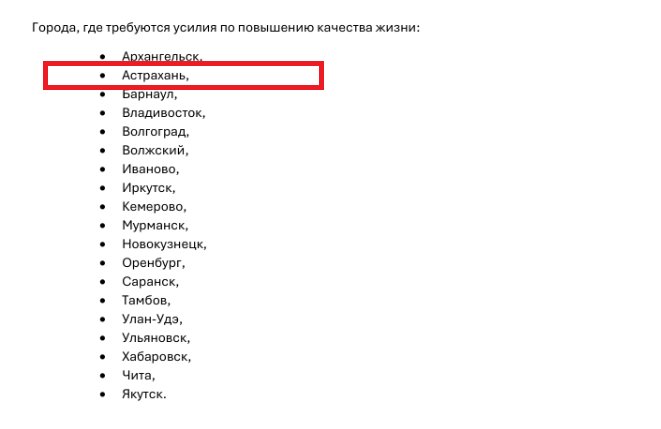 Что касается Астрахани, то среди наиболее актуальных для города проблем выделяют плохую медицину, низкий уровень жизни, плохую доступность жилья, конфликтность общественных отношений и недостаточные возможности для получения образования. Авторы исследования ссылаются на информацию, полученную непосредственно от самих астраханцев в ходе опросов. Однако подобные примеры проблем без труда можно привести почти для любого населенного пункта нашей страны. За исключением, разве что, мегаполисов (и то, не факт).