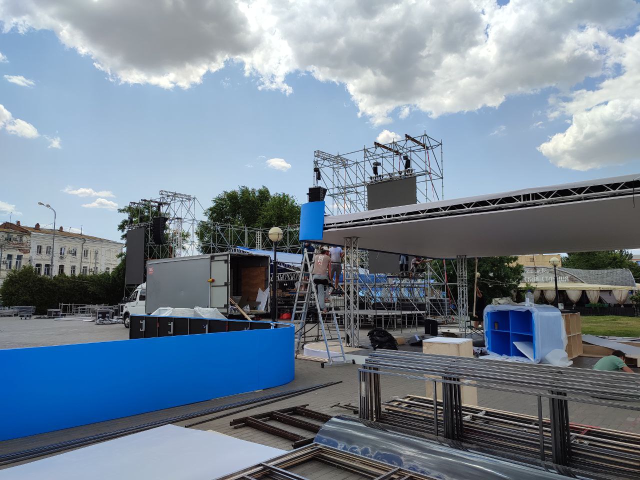Кстати, строительство главной сцены уже началось. Прямо сейчас можно увидеть ее каркас возле Петровского фонтана.