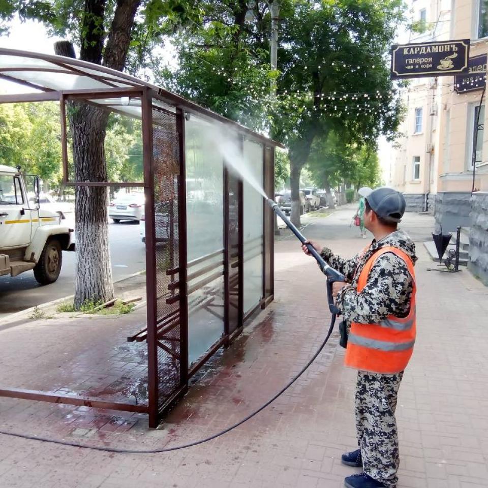 Сегодня специалисты продолжили приводить в порядок городские объекты. В частности, помыли остановочные комплексы на улицах Ленина, Советской и Калинина.