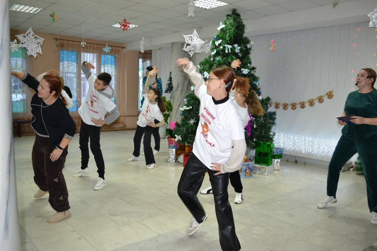 Дед Мороз и Снегурочка поделились своим новогодним настроением с участниками зарядки, продолжили веселье подвижными танцами и хороводом.