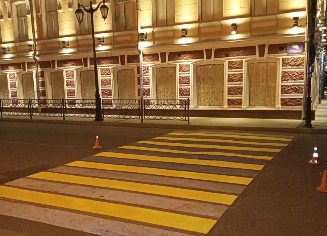 Ночью на ключевых дорогах и улицах Астрахани кипит работа. На проезжей части наносят разметку — «зебру». Ее обновили на 89 пешеходных переходах.