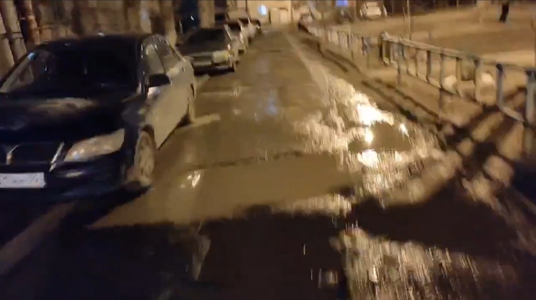 Там легковые машины припаркованы прямо на сухом тротуаре возле подъездов. Пешеходы идут по разбитой дороге, на которой огромные лужи.