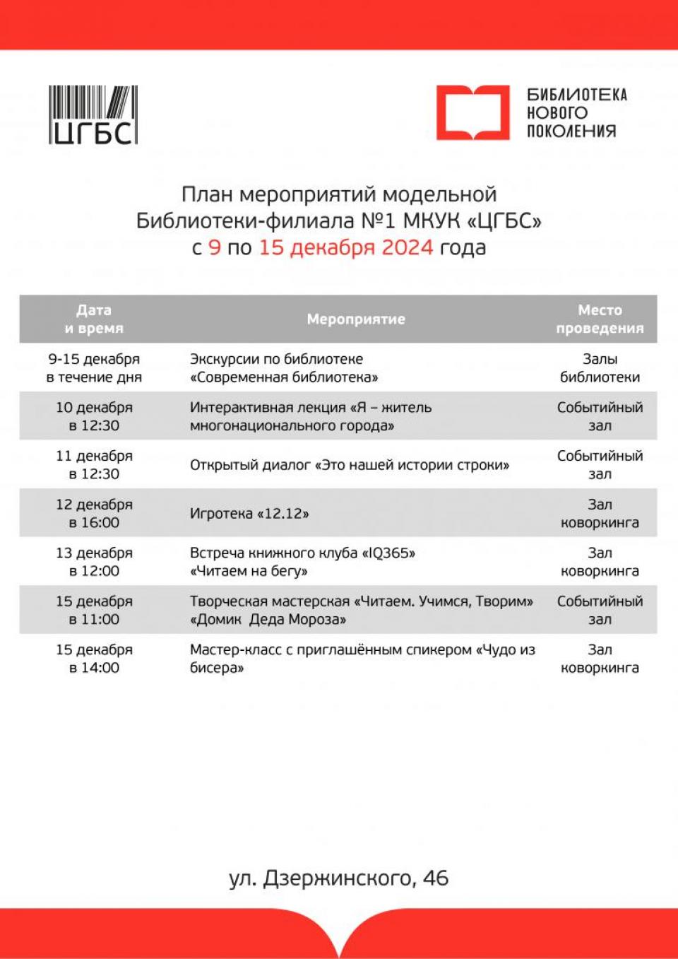 Кроме того, на этой неделе в этой модельной библиотеке пройдет мастер-класс «Открытие почты Деда Мороза», игротека, библиоквиз. Не менее насыщенной будет программа и в аналогичном учреждении на ул. Дзержинского, 46. Здесь запланирована встреча книжного клуба, работа творческой мастерской, интерактивная лекция. О том, какие еще мероприятия будут организованы на этой неделе в данных учреждениях, рассказано в карточках.