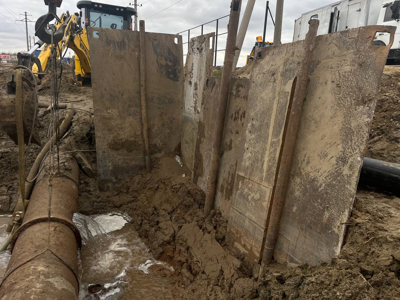 Причина аварийной ситуации — продольная лопина длиной в 2 метра на трубопроводе Ду-630 мм. Возможность производства работ обеспечили за счет установки металлических панелей, препятствующих обрушению грунта. Специалисты «Астрводоканала» уже изготавливают раструбную сварную муфту Ду-680мм, после установки которой водоснабжение будет нормализовано.