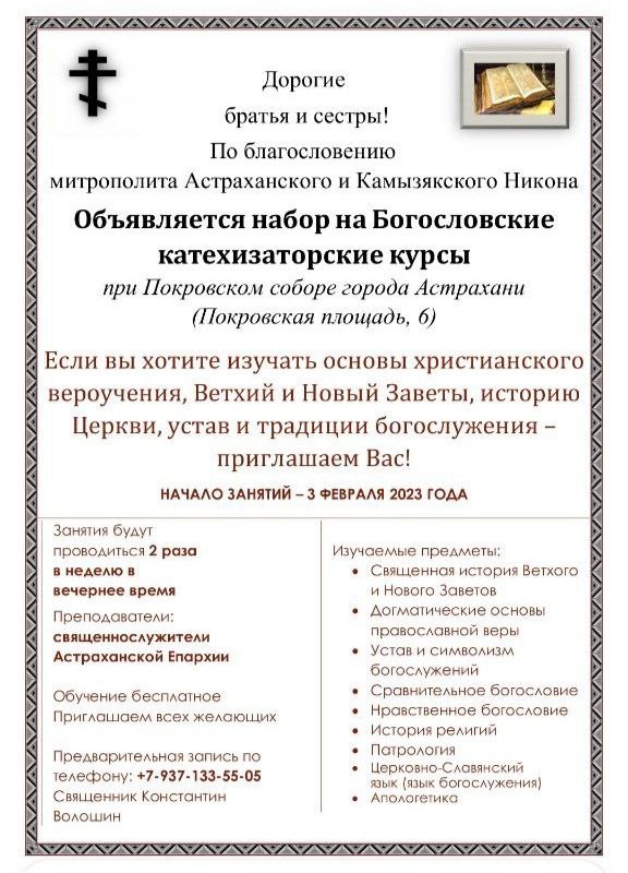 Об этом сообщили в пресс-службе Астраханской епархии. Начался набор на катехизаторские курсы при Покровском соборе, расположенном на площади Покровской, 6. На занятиях будут обучать основам христианского вероучения и богослужения,