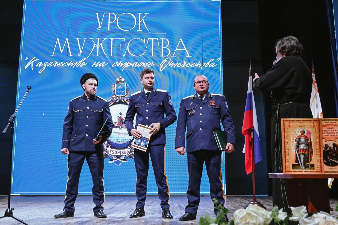 Позже в большом зале Астраханской государственной филармонии прошел Урок мужества «Казачество на страже Отечества». С приветственным словом выступил атаман Дмитрий Заплавнов и пожелал подрастающему поколению здоровья и крепости духа: «Каждый из вас должен вырасти таким достойным человеком, героем, как те, о ком мы сегодня вспоминаем!».