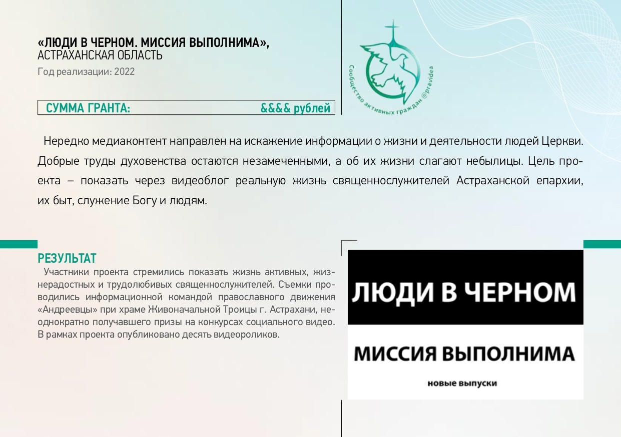 Участники проекта «Люди в черном. Миссия выполнима» из Астраханской области показали жизнь активных, жизнерадостных и трудолюбивых священнослужителей через создание и публикацию в социальных сетях десяти видеороликов.