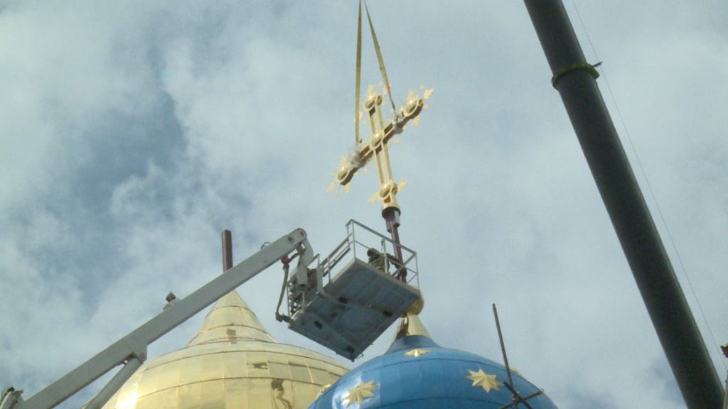 А вчера на православной святыне засияли и купола – их изготовили в столичной мастерской. Малые выполнены облицовкой из листов меди с последующей окраской. Высота большого позолоченного купола – 12 метров, четырёх маленьких голубых с золотыми звёздами – 6,5 метров. После молебна и освящения крестов начался их подъём на 45-метровую высоту. Стропальщики обвязывали их тросами и поднимали вверх стрелой автокрана.
