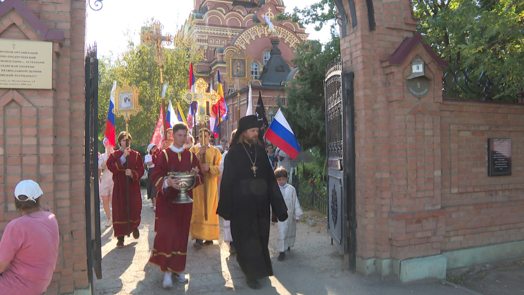 Наместник Иоанно-Предтеченского монастыря игумен Петр окропил святой водой всех участников крестного хода. Под звон колоколов прихожане, казаки, школьники прошли путь от этой обители до старинного Введенского храма. В руках у участников шествия хоругви, а также знамена: “Спас Нерукотворный”, Суворовское, казачьи и знаменитый российский триколор. Первый прототип будущего российского флага родился в XVII веке и изначально ассоциировался с флотом. Идею создания этой святыни подали главные деятели кораблестроения в Астрахани во времена царя Алексея Михайловича. И корабль «Орёл» совершил с флагом свои первые морские походы.