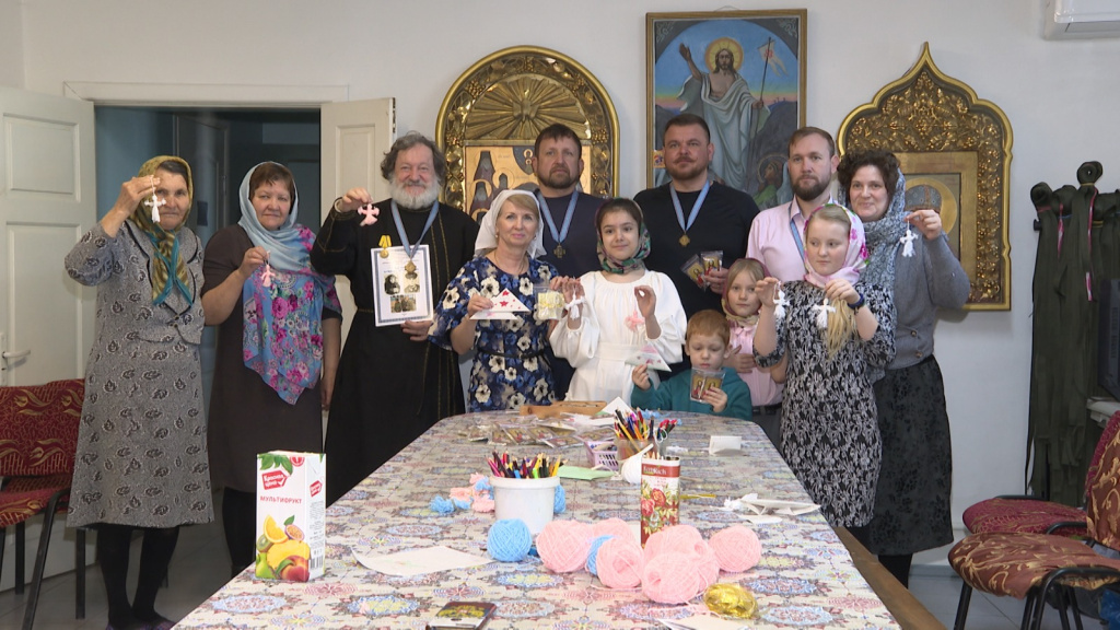 Православно-патриотическая песня в исполнении поэта и барда Владимира Никитина сразу настроила собравшихся на торжественный лад. За столом дети из воскресной школы, члены православного клуба имени преподобного Сергия Радонежского. А также гости из регионального фонда "Защитники Отечества" и члены Императорского Православного Палестинского общества. Они тоже участники акции "Ангелы для бойцов". Начало благому делу положили дети, которые начали мастерить ангелов из белоснежной пряжи с золотыми крыльями.