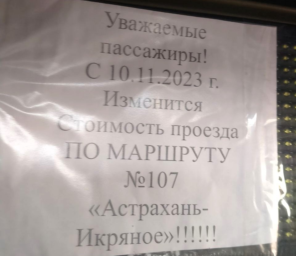 Проезд в маршрутке №107, которая ходит между Икряным и Астраханью станет дороже на 20 рублей, сообщает Telegram-канал «Икряное 24» , сопровождая пост фотографией объявления о грядущем подорожании.