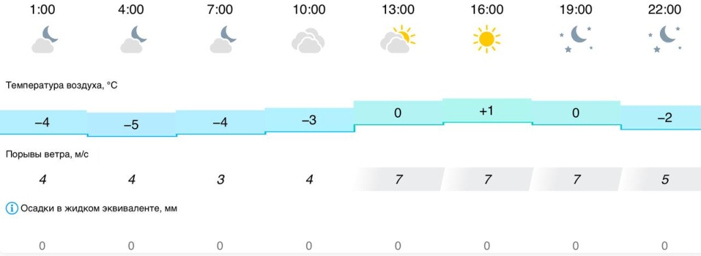 С утра столбик термометра покажет 5 градусов мороза, днём воздух прогреется до +1, а вечером температура опустится до -2. Согласно прогнозам синоптиков, небо периодически будут закрывать тучи, скорость ветра составит от 4 до 7 метров в секунду, осадков не ожидается, а уровень атмосферного давления будет незначительно превышать норму. Солнце взойдёт на небосвод 8:27, а зайдёт за него в 17:27.