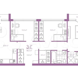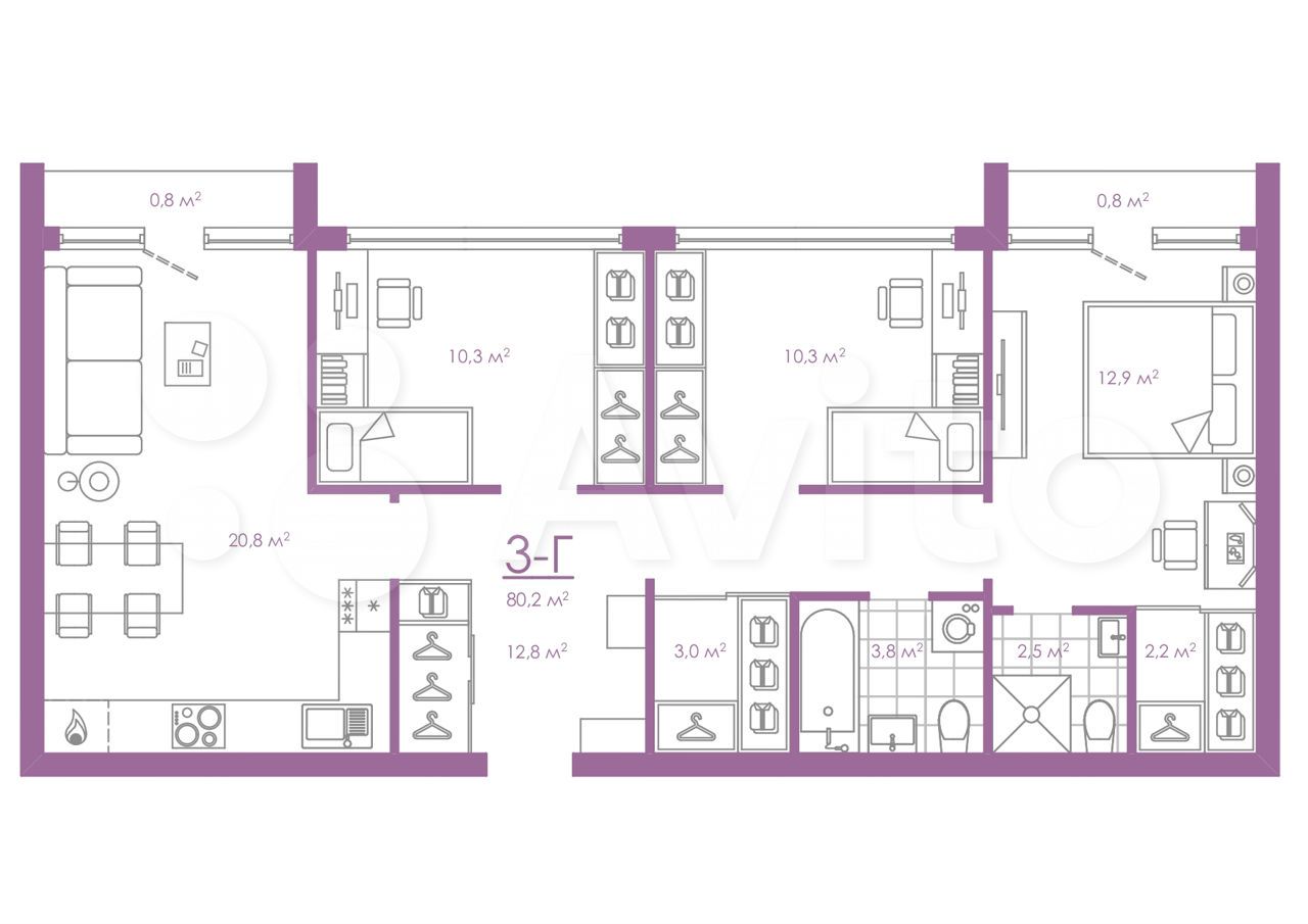 Планировка 3 Г - это европейский формат трехкомнатной квартиры. Отдельная спальня для родителей со своим гардеробом и санузлом, две детские комнаты, просторная кухня-гостиная, просторный гардероб и шкаф для хранения в холле, два балкона.