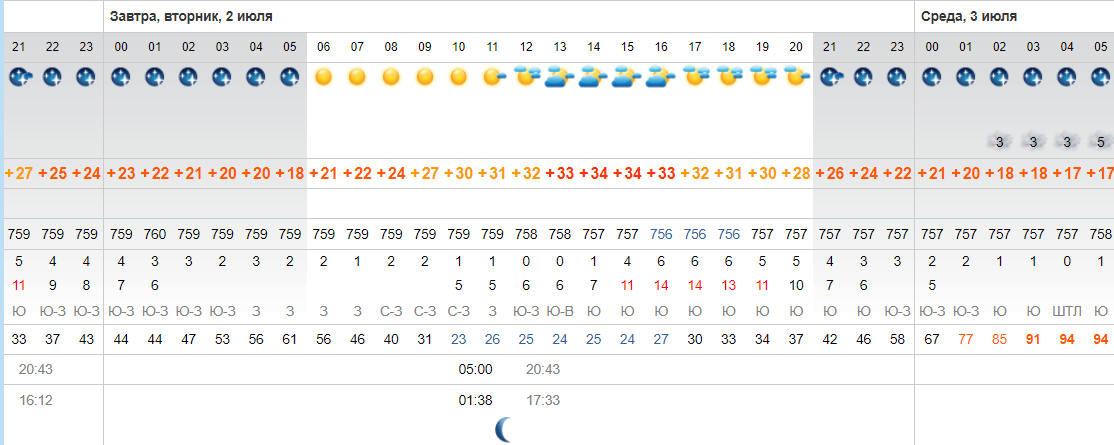 Как мы сегодня уже сообщали, первая декада июля окажется жаркой, что будет особенно заметно на контрасте с периодом прохлады в конце ушедшего месяца. В дневное время воздух прогреется до +34 градусов. Астраханцы снова фиксируют на своих термометрах рекорды жары, но отметим, что показатели может искажать ряд факторов, в том числе температура поверхности, с которой соприкасается измерительный прибор. Ночь на среду будет еще относительно прохладной, температура воздуха составит +17..+21 градус. Осадков не ожидается, погода после полудня преимущественно облачная. Атмосферное давление снизится до 756 мм рт. ст. Влажность воздуха в дневные часы ниже климатической нормы, а ночью ситуация будет обратной, местами даже возможен туман. Порывы ветра южного направления во второй половине дня будут достигать 14 м/с. Луна убывающая. 2 июля православные чтят память святого Зосимы Аполлониадского, в народном месяцеслове — Зосима Пчельник. Считалось, что в этот день пчелы жалят только отпетых грешников, однако и праведникам завтра, как и всегда, советуем быть осторожными с насекомыми и другими кусачими созданиями. Солнечная погода указывает на то, что осадков будет мало в течение всего июля.
