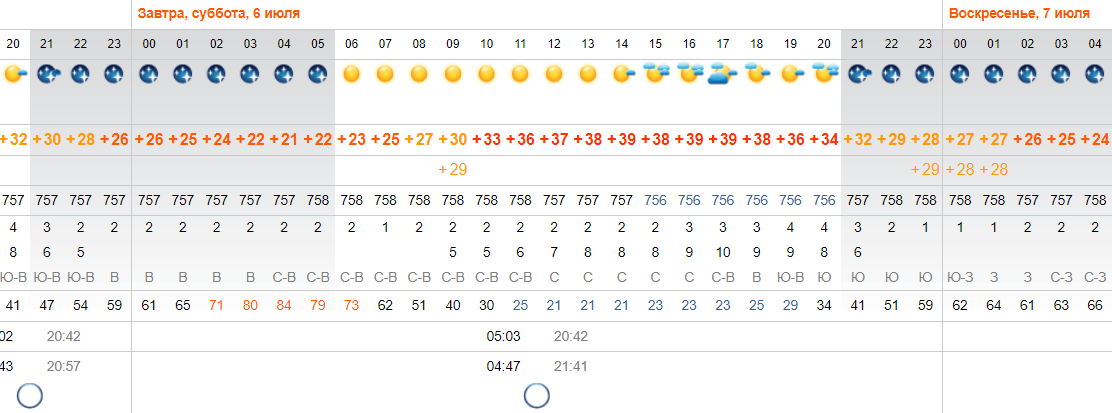 Прогнозы синоптиков не оставляют надежды на снижение температуры. Но астраханцы из числа оптимистов принимают этот факт положительно: наконец можно искупаться в реке, вода даже не успевает остыть за ночь. Напоминаем, что нужно избегать нахождения на пляже в часы повышенной солнечной активности. Температура воздуха в дневные часы будет подниматься до +40 градусов, не исключено, что и выше. Ночи тоже остаются чересчур теплыми, столбик термометра после заката не опустится ниже +24 градусов. Дождей не прогнозируют, погода ясная и сухая. Атмосферное давление упадет до 756 мм рт. ст. Ветер сменится на северо-восточный и будет дуть с порывами до 8 м/с. Новолуние. 6 июля православные вспоминают святую мученицу Агриппину, в народном месяцеслове - Аграфена Купальница: это день предшествует празднику Ивана Купалы. Туман предвещает осадки. "Сухая" гроза - к продолжительной засухе.