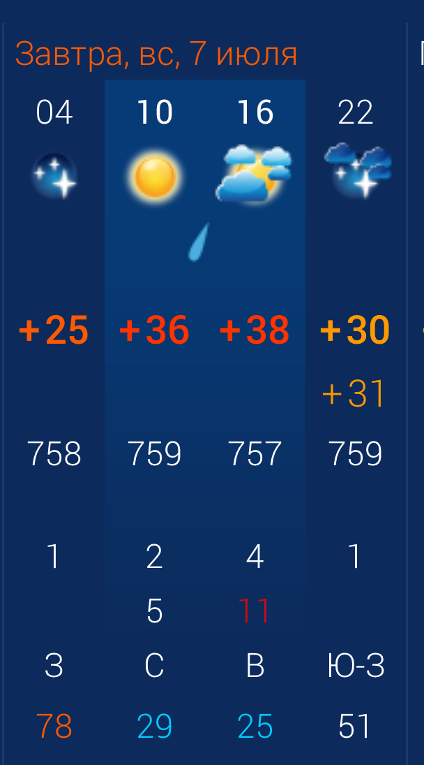 Завтра в Астраханской области будет жаркая погода. Днем возможен кратковременный дождь. Утром температура воздуха в городе составит +36 градусов. Днем поднимется до +38. К вечеру температура упадет до +30. Астраханцев ждет восточный ветер со скоростью 4-11 м/с. Атмосферное давление составит 757 мм рт. ст. Влажность воздуха в пределах нормы. На территории всего региона будет северный ветер со скоростью 5 – 10 м/с. Температура воздуха ночью опустится до +20 градусов, а днем повысится до +40. Ожидается сильная жара. Днем местами кратковременный дождь, гроза. Погодные приметы: Наши предки считали: дождь в жару — к хорошей рыбалке. Также существует поверье: красный закат — к ветряной погоде.
