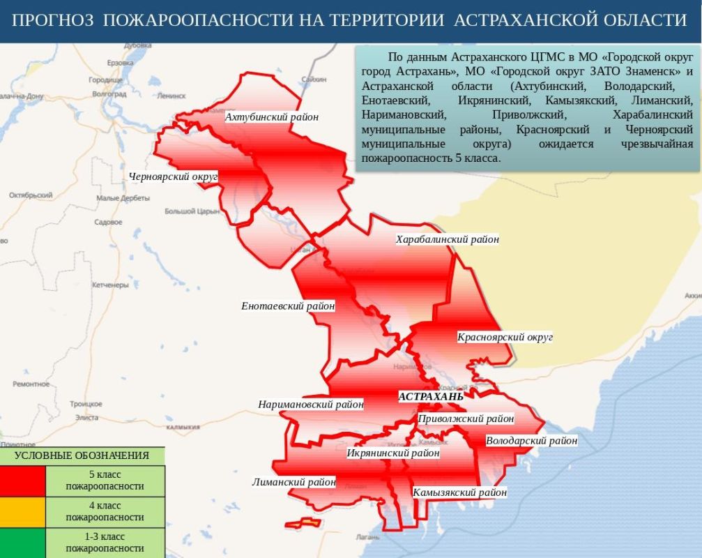 Прогноз пожарной опасности (по данным Астраханского ЦГМС): в Астрахани, Знаменске и Астраханской области (Ахтубинский, Володарский, Енотаевский, Икрянинский, Камызякский, Лиманский, Наримановский, Приволжский, Харабалинский муниципальные районы, Красноярский и Черноярский муниципальные округа) ожидается чрезвычайная пожароопасность 5 класса. На карте территории с 5 классом пожарной опасности помечены красным цветом.