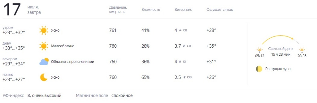 Днём столбик термометра покажет чуть больше, чем утром, а именно 35 градусов выше нуля. Атмосферное давление в норме. Ветер обещает быть северо-западного направления, до 4 м/с.