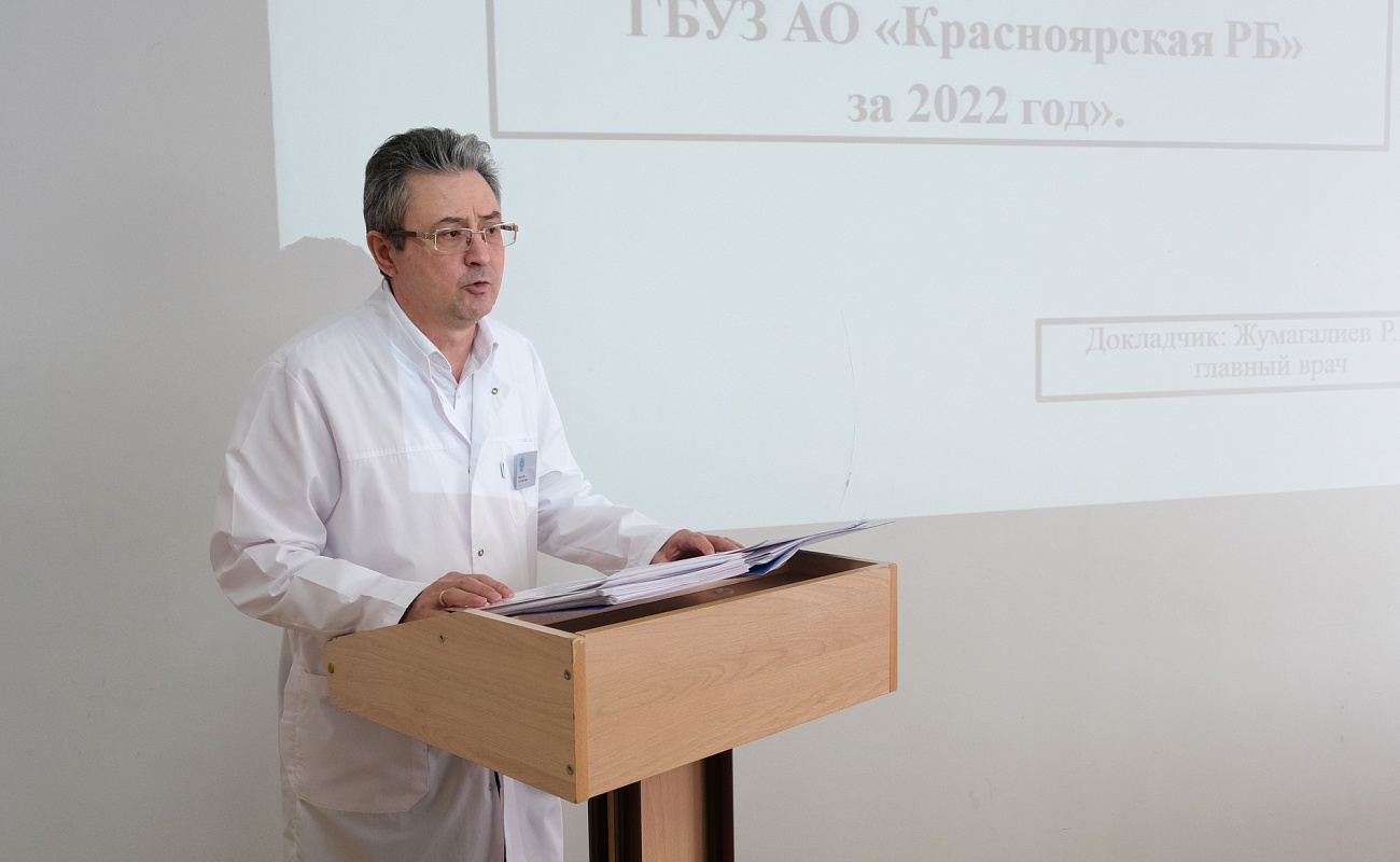 Об итогах работы в прошлом году и задачах на 2023-й рассказал главный врач ГБУЗ АО «Красноярская РБ» Р.М. Жумагалиев. Он затронул вопросы, связанные с демографией, проведением диспансеризации, кадрового обеспечения, финансового состояния учреждения и исполнения целевых программ, финансируемых за счёт средств бюджета.