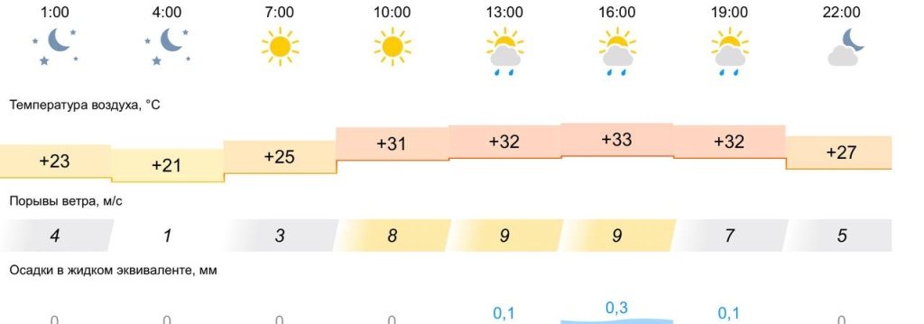 С утра столбик термометра покажет 25 градусов тепла, днём температура поднимется до +33, а вечером опустится до +27, ветер будет дуть со скоростью до 9 метров в секунду. Ближе к полудню синоптики прогнозируют небольшой дождь, атмосферное давление ниже нормы, поэтому у метеозависимых может наблюдаться ухудшение самочувствия. Восход ожидается в 4:55, а закат в 20:39.